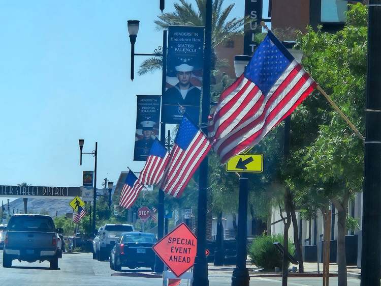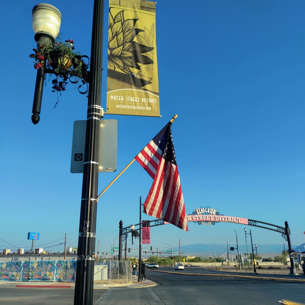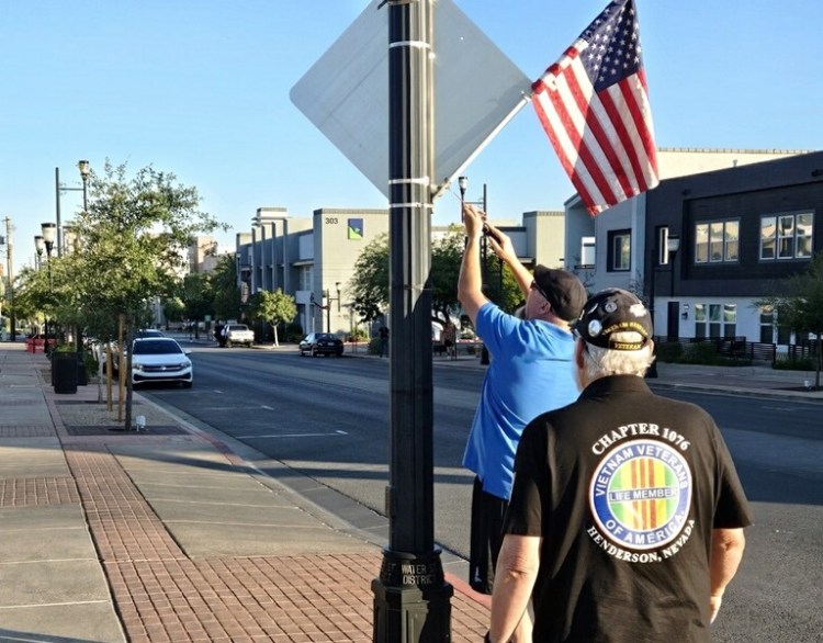 Flags Up! On Water Street District, Henderson installation by Vietnam Veterans of America, Chapter 1076, Thank you Cal Haggen, Philip Webb, Ralph Miranda, Michael Schwartz and Shelly Berkowitz helping the city of Henderson honor Armed Forces Day and continues through Memorial Day. Well Done Crew !!