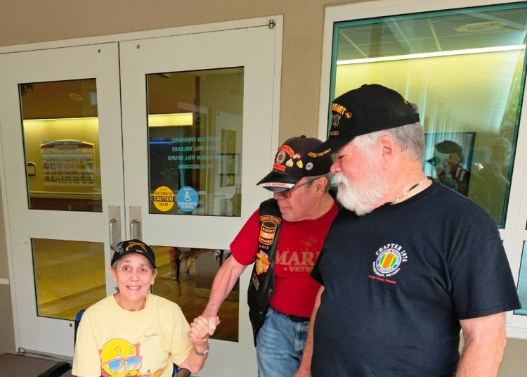 The Fleet Reserve Association Branch 90 hosted a cake party commemorating the 235 Birthday of the Coast Guard and Purple Heart Day. Members of VVA 1076 volunteered as well as Commander Ken Gonzalez, Military Order of the Purple Heart Chapter 730. The party started with FRA President Jed Levine leading the group in the Pledge of Allegiance. CG Veteran Rick Kaufmann Welcomed and Thanked the residents for their service. Rick spoke about the history Coast Guard, Commander Gonzalez spoke about the importance of remembering our heroes and the history of the Purple Heart. Two cakes were then displayed and cut. The first cut was by a 27-year RM CG Vet then Ken with a Purple Heart Veteran cut the other Cake. Attending the celebration was 1076’s Ann Sweat , who was all smiles with a visit from her friends. FRA will be back to celebrate the Navy birthday in November. The FRA is proud to host these events with assistance from other Veterans’ groups as well as the staff from the home. Well Done !!