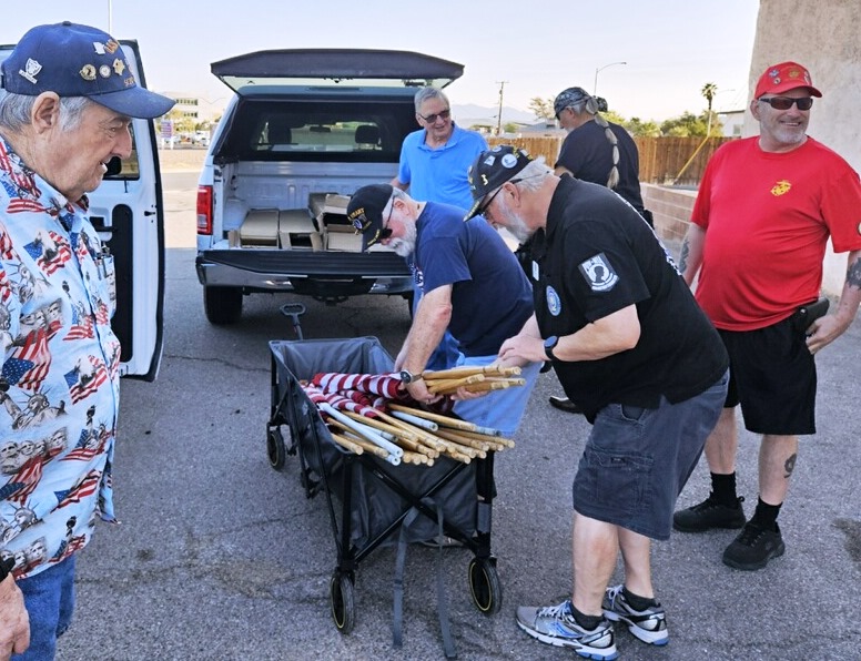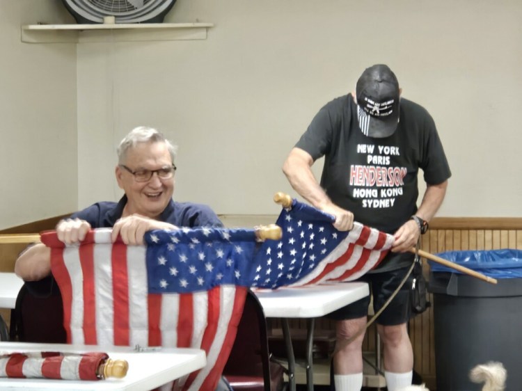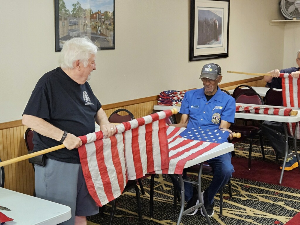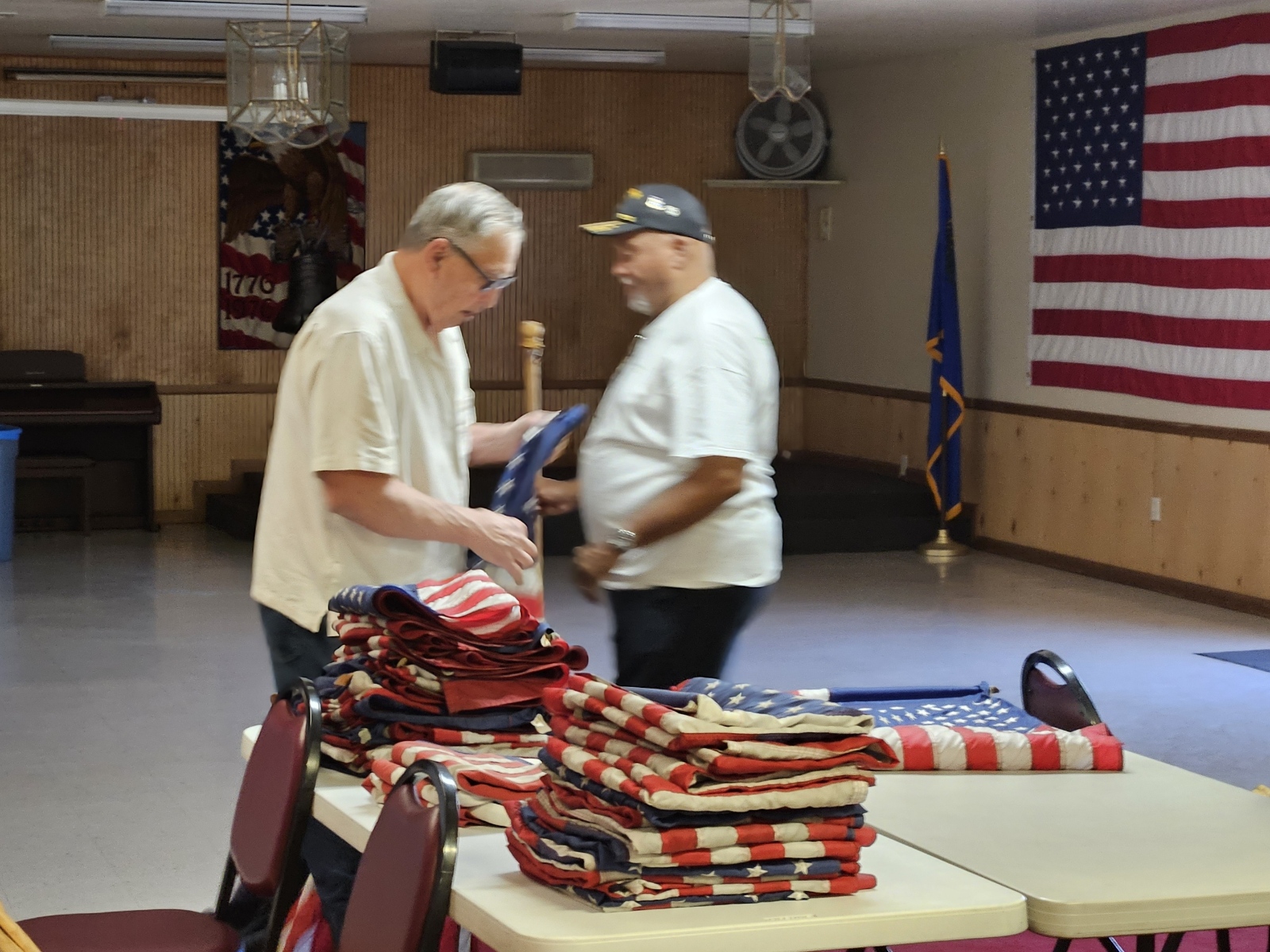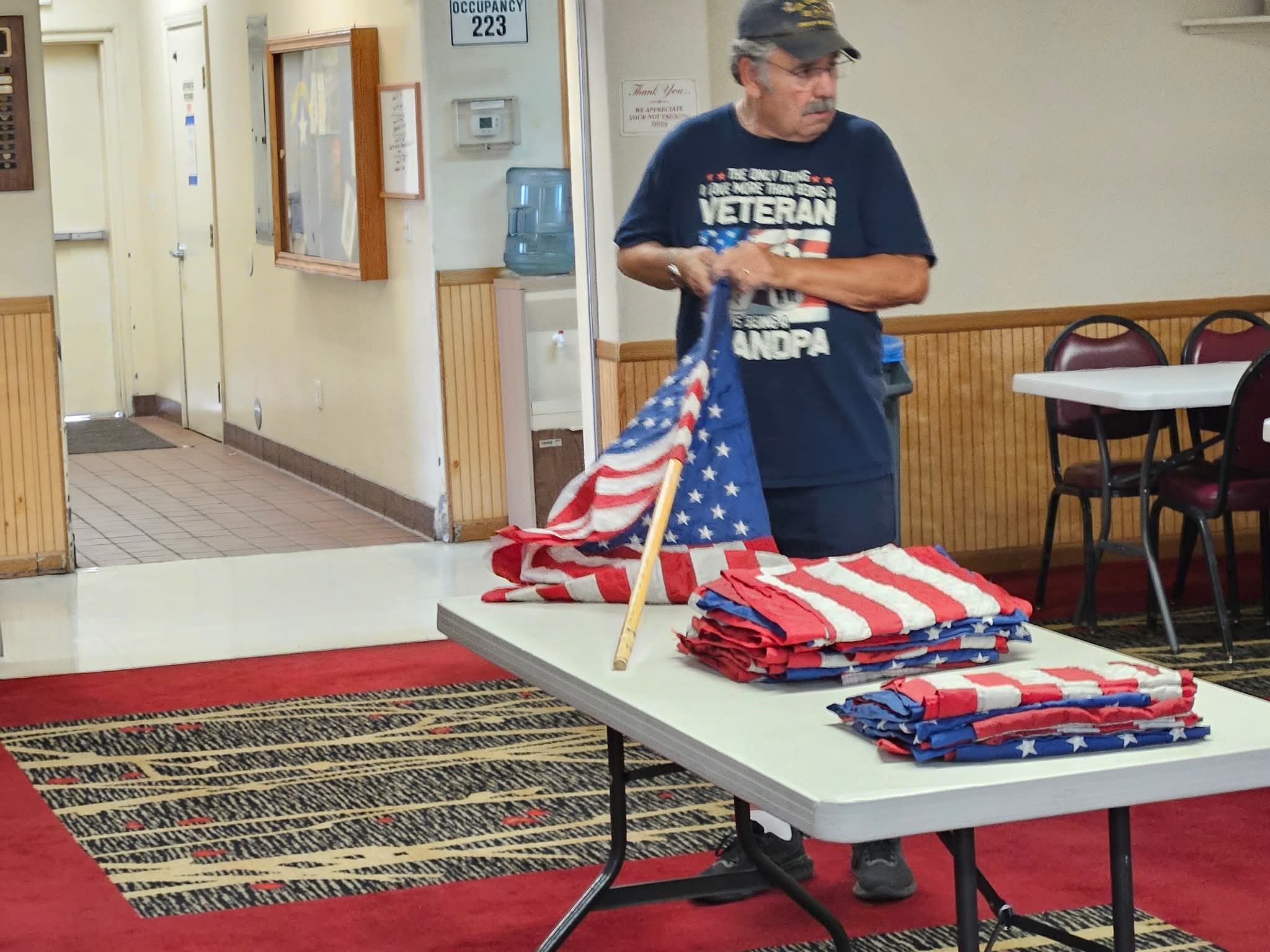 1000 back at the American Legion building for Part 2 of the work party. The crew received instructions from Fred and began reassembling the flags. Two Kaufmann grandsons joined in, both Roman and Elliot helped also kept track of how many flags were ready. The flags were transported back to the storage room at Wells Fargo. The flags will look great for the Fourth of July weekend. Will done. BZ !!