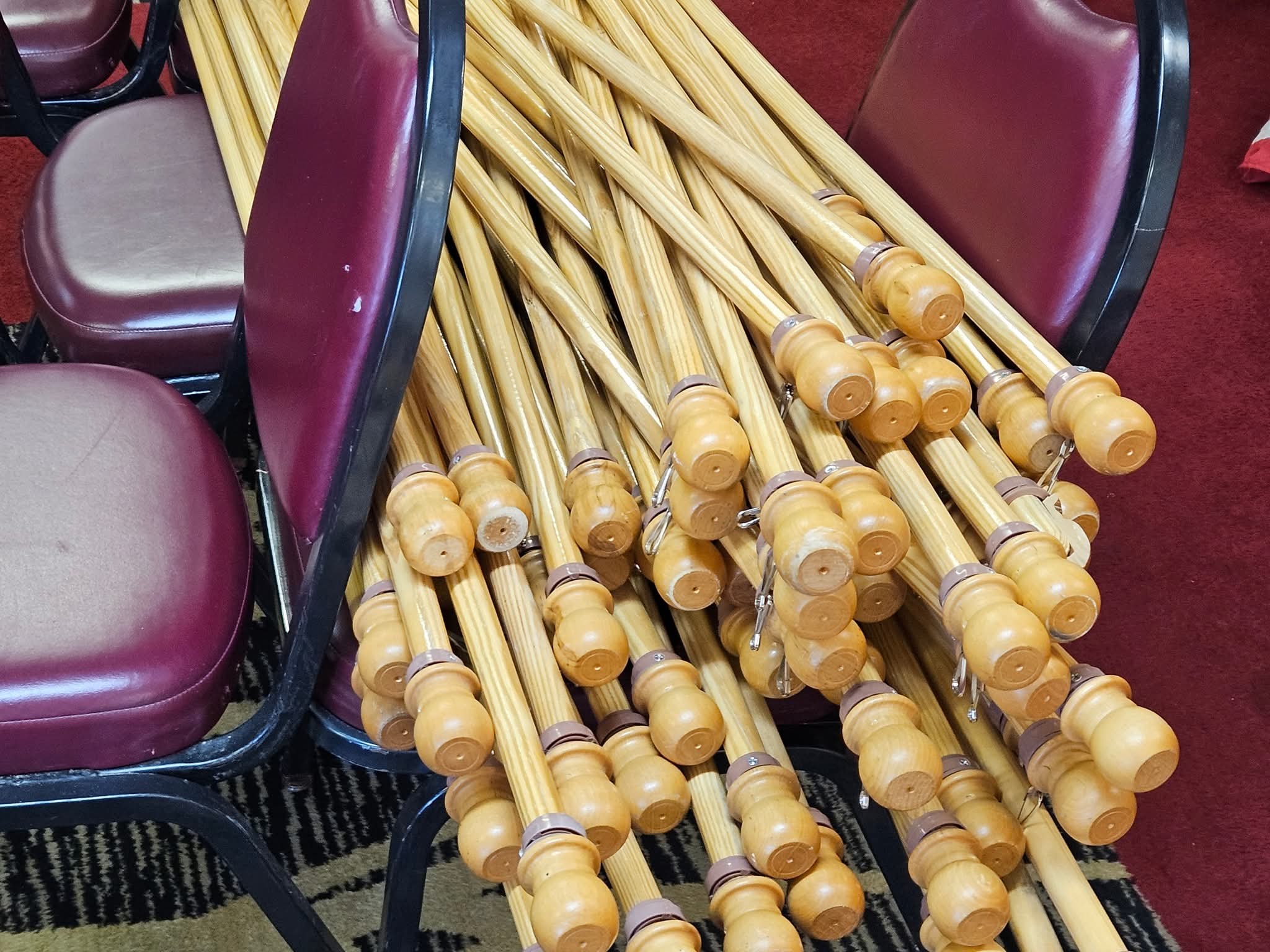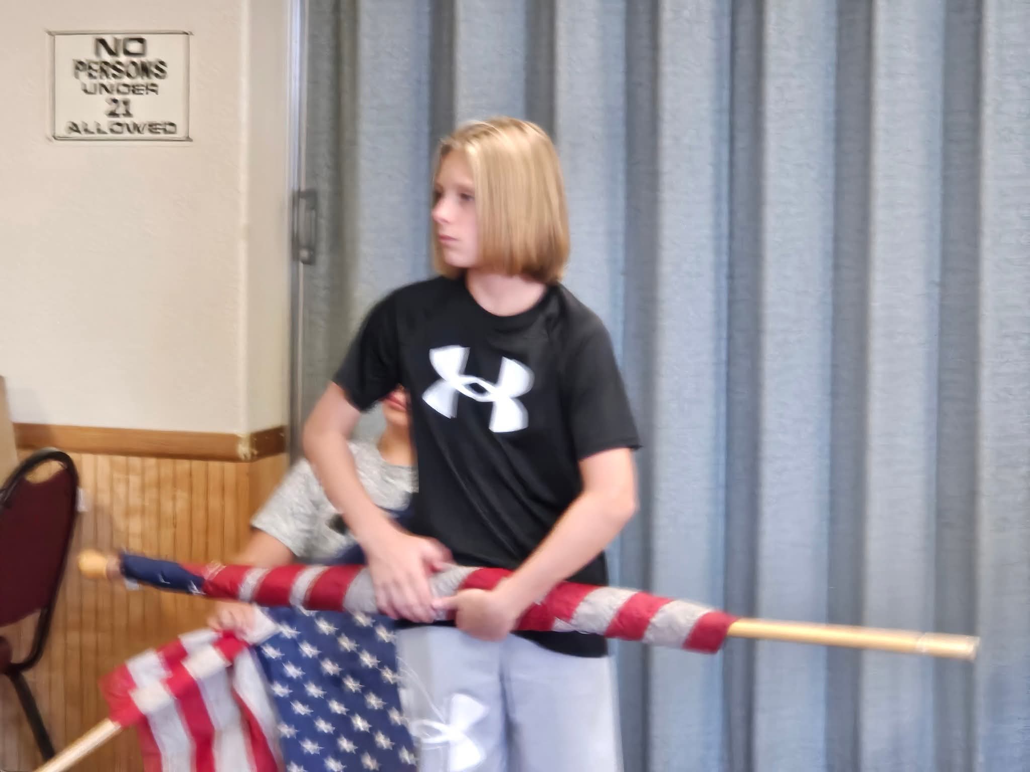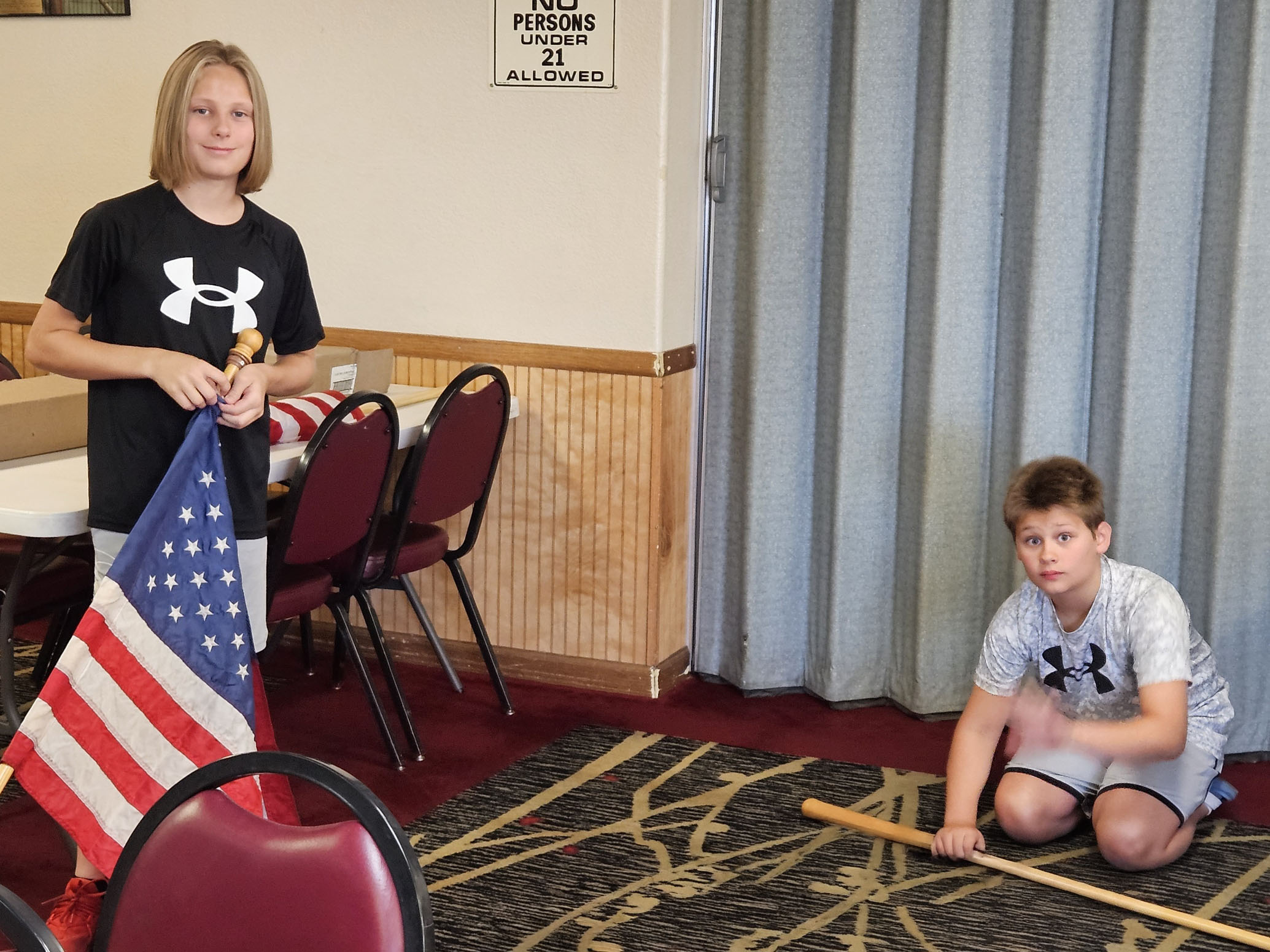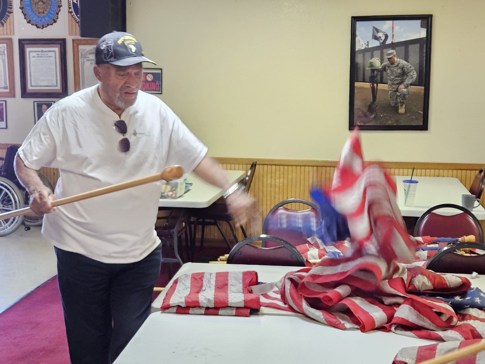 1000 back at the American Legion building for Part 2 of the work party. The crew received instructions from Fred and began reassembling the flags. Two Kaufmann grandsons joined in, both Roman and Elliot helped also kept track of how many flags were ready. The flags were transported back to the storage room at Wells Fargo. The flags will look great for the Fourth of July weekend. Will done. BZ !!