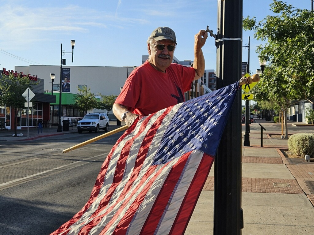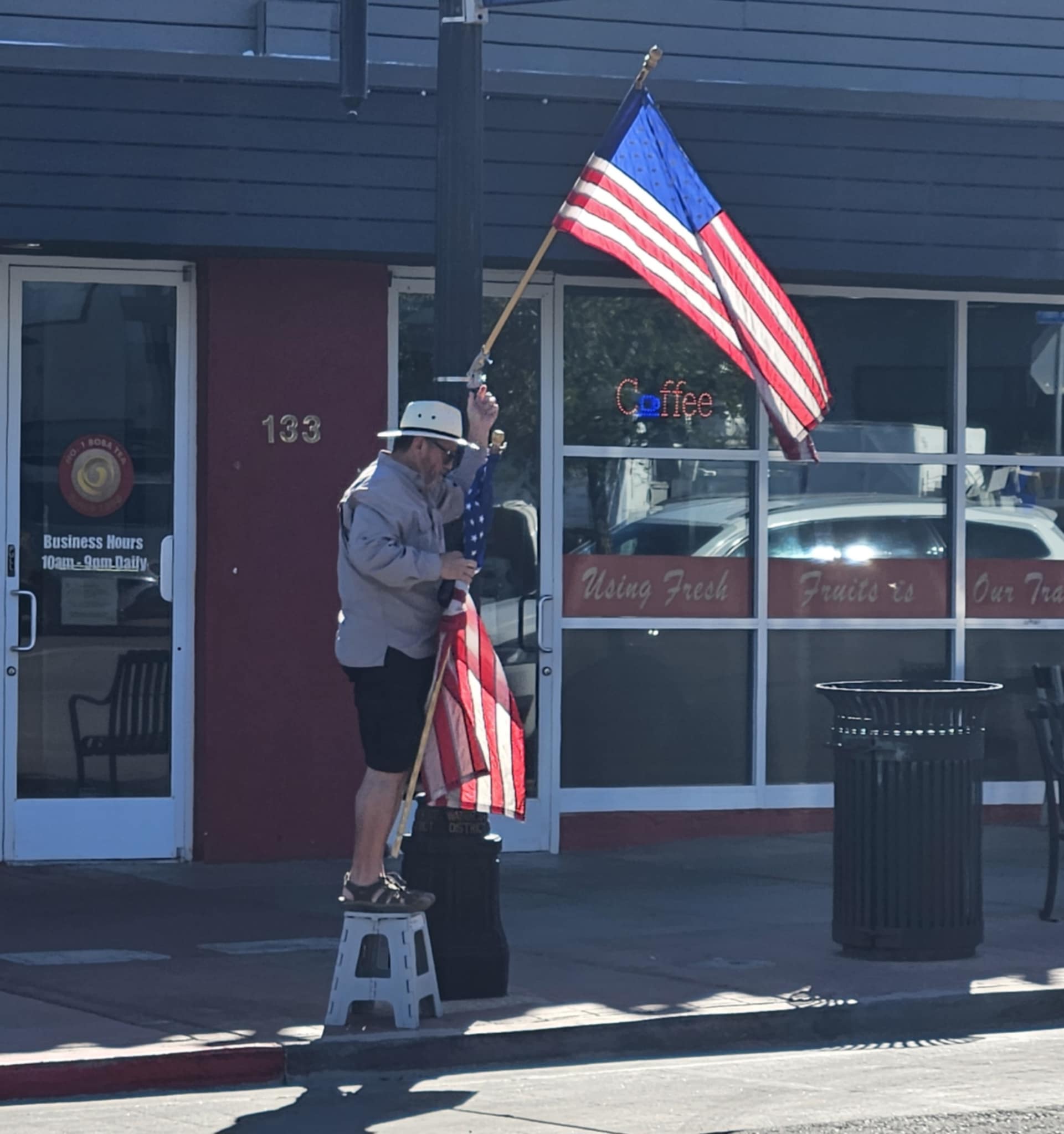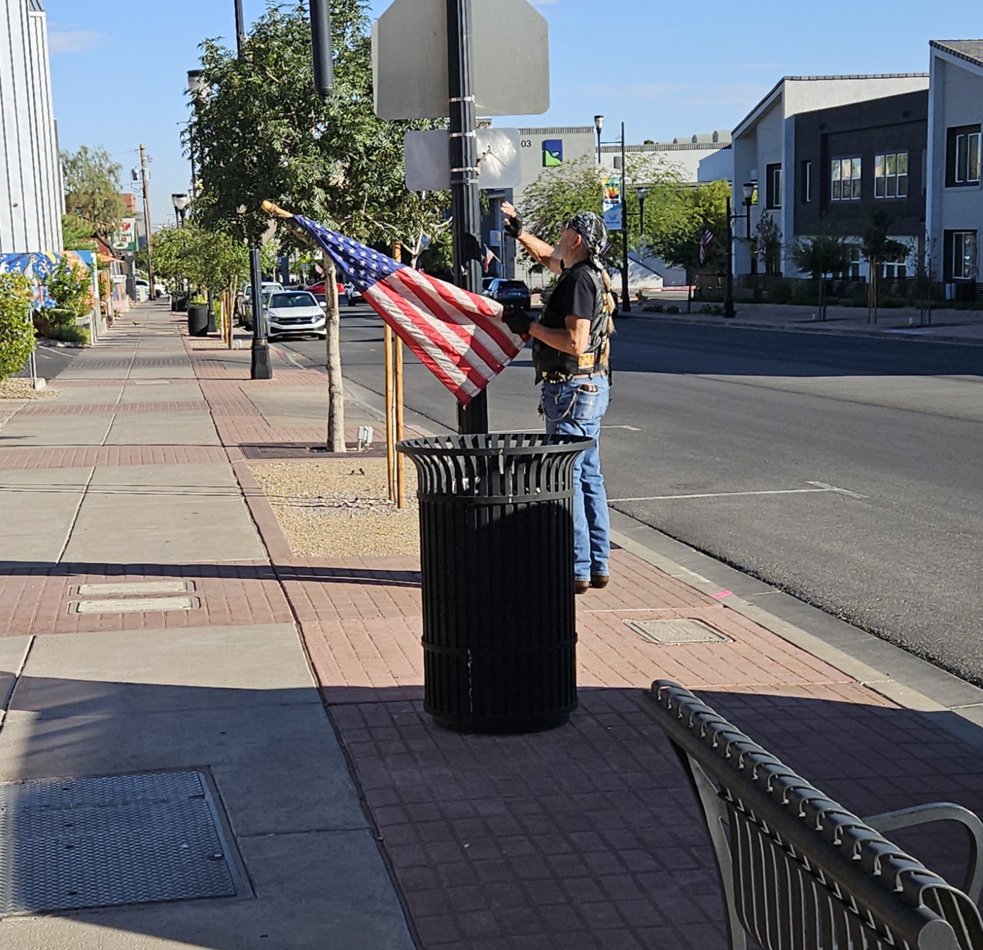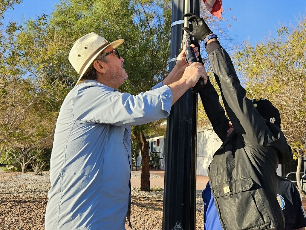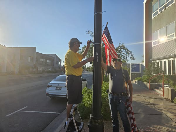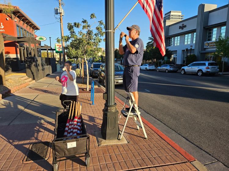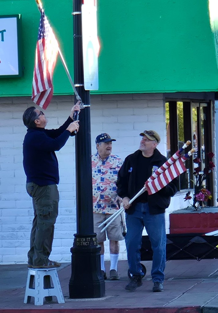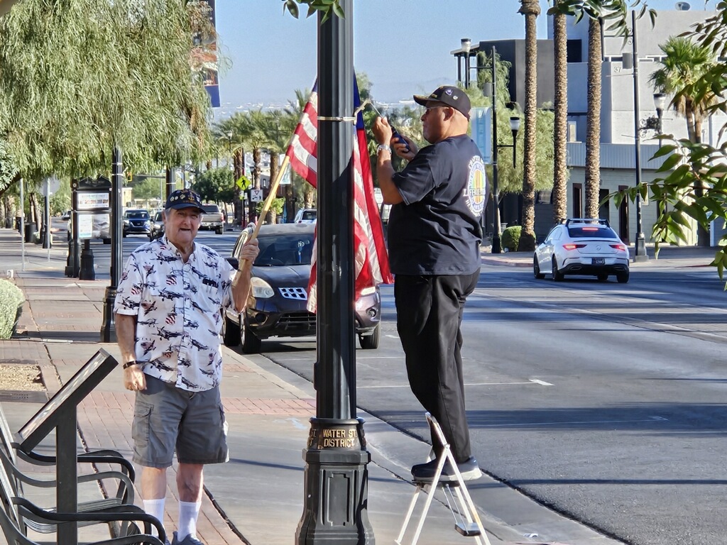 Thank you to those able to help installing the flags on Water Street, Henderson. Thank you! Cal Haggen for making repairs to the flag holders. Flags went up at 0700 and after the Crew enjoyed breakfast at the Peak.