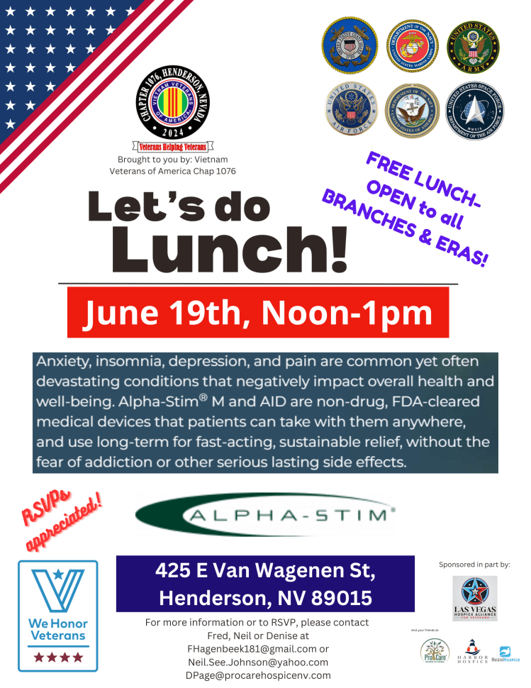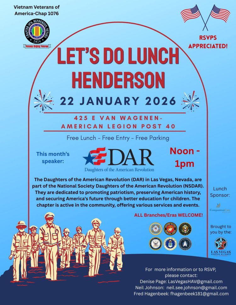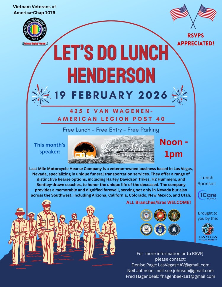Barbara Rodgick can be contacted at Standupforbill@gmail.com or 425-442-7563. There were opportunities for questions as well as a Lunch Buffet provided by ProCare Hospice of Nevada. The Let’s Do Lunch education series is open to all interested folks. Please consider attending the next one. Check the VVA 1076 Calendar for the latest flyers and information.