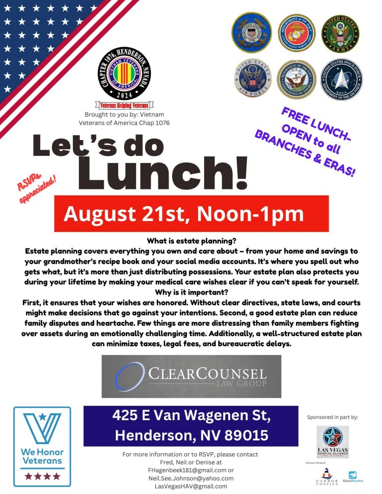 This month’s Let’s Do Lunch lecture focused on Estate Planning, Trusts and Probate. Attorney Kevin Turek from Clear Counsel Law Group covered the basics of estate planning and probate. His presentation was well received with many questions were asked at the end. Next month’s session will focus on receiving your Veterans Benefits from Barbara Rodgick. A Free Lunch was provided by the Las Vegas Hospice Alliance. Shout out to Denise Page and her crew for continuing this education series.