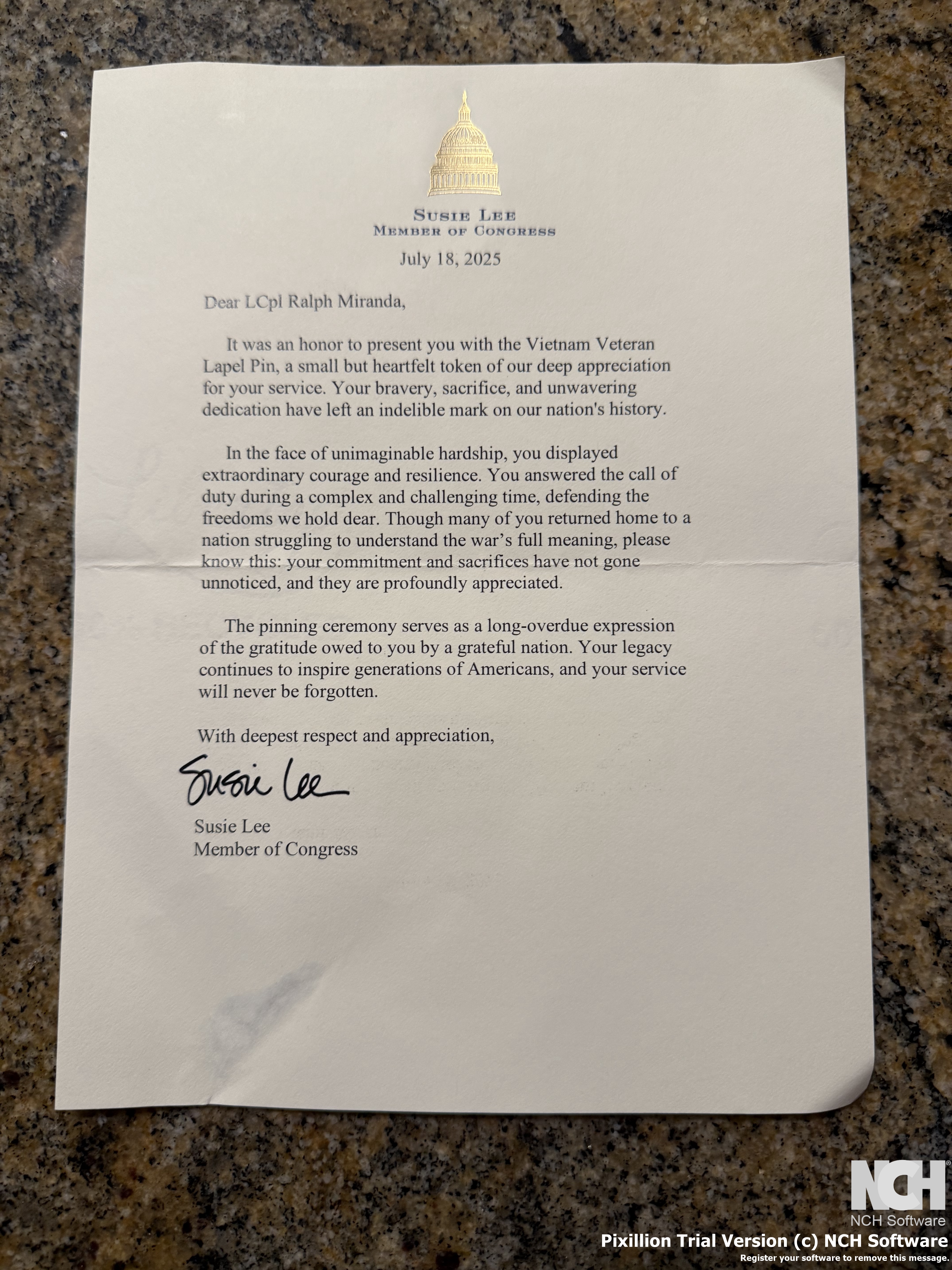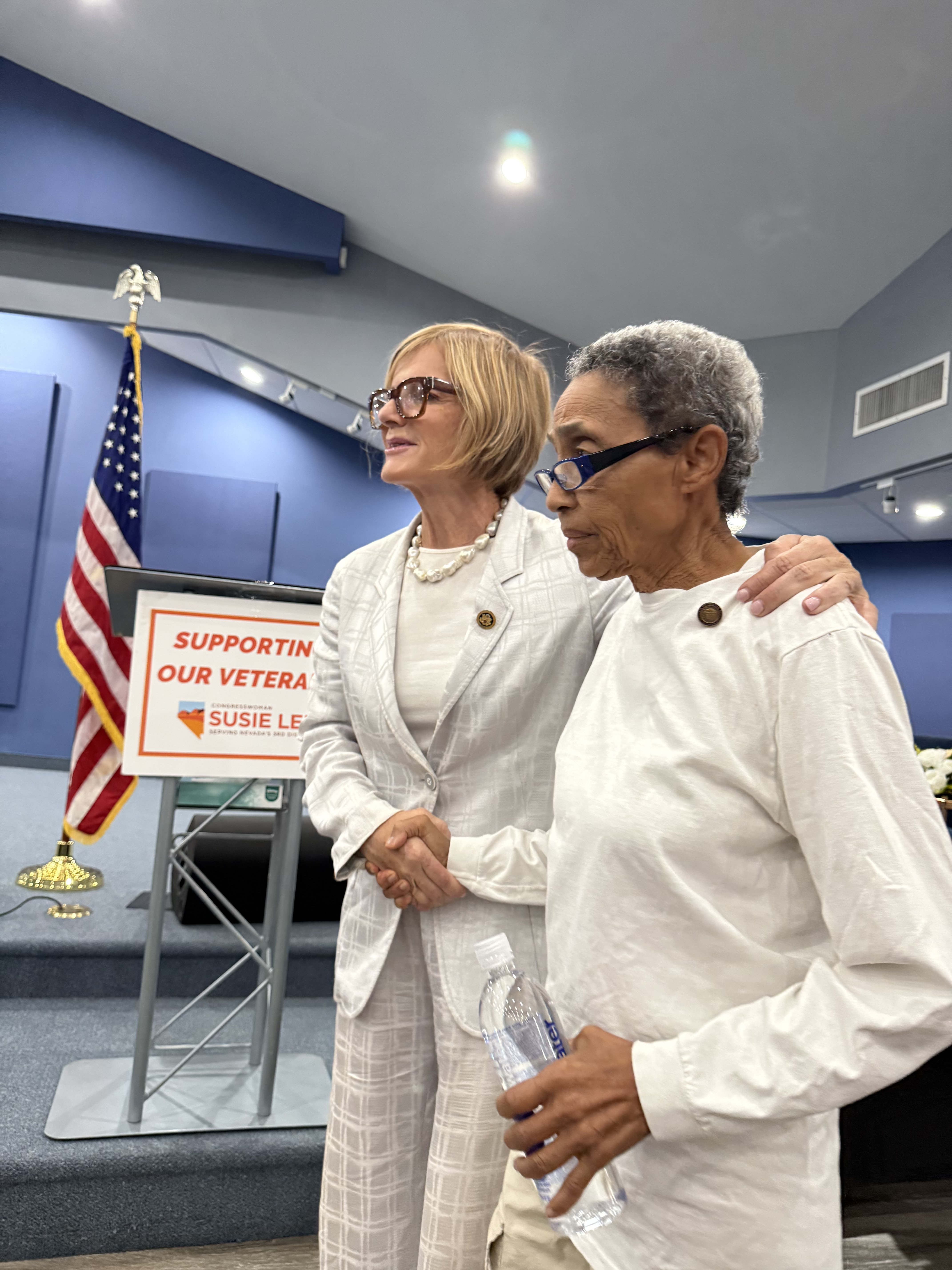 Congresswoman Susie Lee hosted a Vietnam Veterans pinning ceremony to honor our Vietnam Veterans. This pinning ceremony is to commemorate our veterans’ brave service and pay tribute to their contributions to protecting our country during the Vietnam War. Veteran who served at any time on active duty in the U.S. Armed Forces, during the period of Nov. 1, 1955 to May 15, 1975 is eligible to receive one Vietnam Veteran Commemorative pin. Members of VVA 1076 witnessed the ceremony at Mountaintop Faith Ministries in Las Vegas