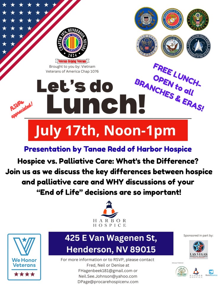 Julys VVA 1076 Let’s do Lunch session was a presentation on Hospice versus Palliative Care. Tance Redd from Harbor Hospice layed the foundation for end-of-life planning. She discussed the decision-making process when you’re at the end of the trail. Taco lunch was provided by the Las Vegas Hospice Alliance. Shout out to Denise Page and crew for continuing this education series.