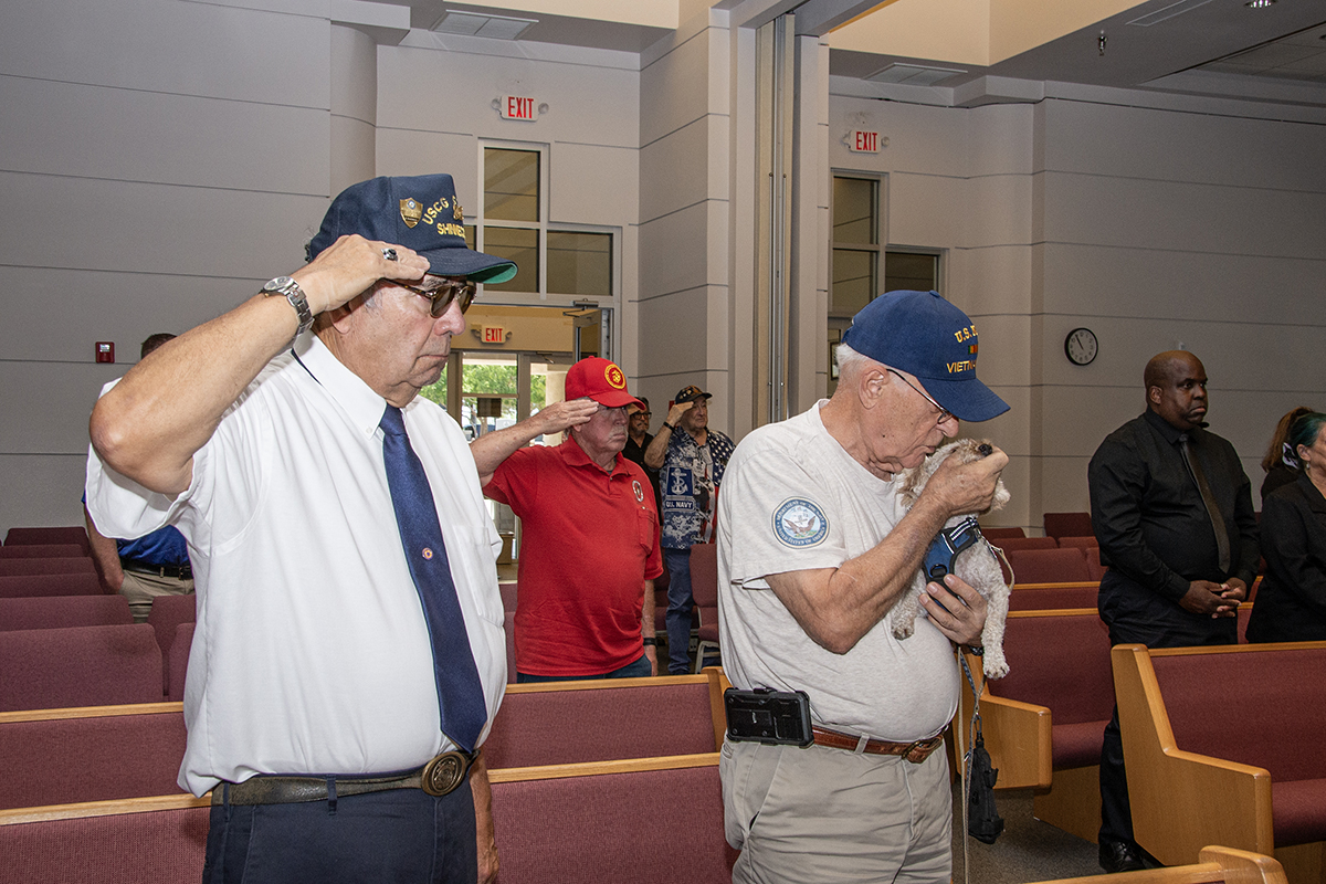 Chapel Services were for 7 Unaccompanied Veterans. An unaccompanied Veteran is a Veteran who does not have family to attend the burial. To make sure no Veteran is forgotten the local veterans groups provide witness for their final rest. Volunteers from the AL, DVA, VVA, Women Veterans and the Patriot Guard execute the Chapel Services. 7 veterans were honored, 2 Coast Guard and 5 Marines. During the ceremony USCG Vet Rick Kaufmann, VVA1076 had the honor of receiving the US Flag for the two Coast Guard Fallen, USMC Vet Robert Wiek, VVA1076 received the US Flag for the 5 Marines. The Coast Guard provided an Honor Guard from Northern California. Two other Coast Guard veterans also witnessed the ceremony, Adam Duran and Mike Barth. About 100 folks witnessed this solemn event with many of them in Red Shirts. Bravo Zulu to all the volunteers who routinely participate in the ceremonies and especially the Coast Guard representatives. Rest in Peace my Brothers, We got the Watch…
