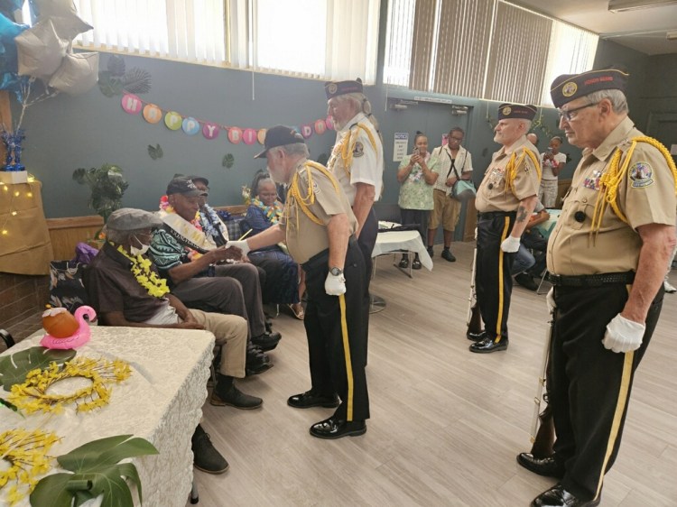 Members of the VVA 1076 Color Guard honored a World War II Army Veteran Edward Shipp during a celebration of his 100th Birthday. Staff Sgt. Shipp was stationed at Pearl Harbor during the war. The event was well attended and the group cheered when his certificate was presented by Michael Berge.