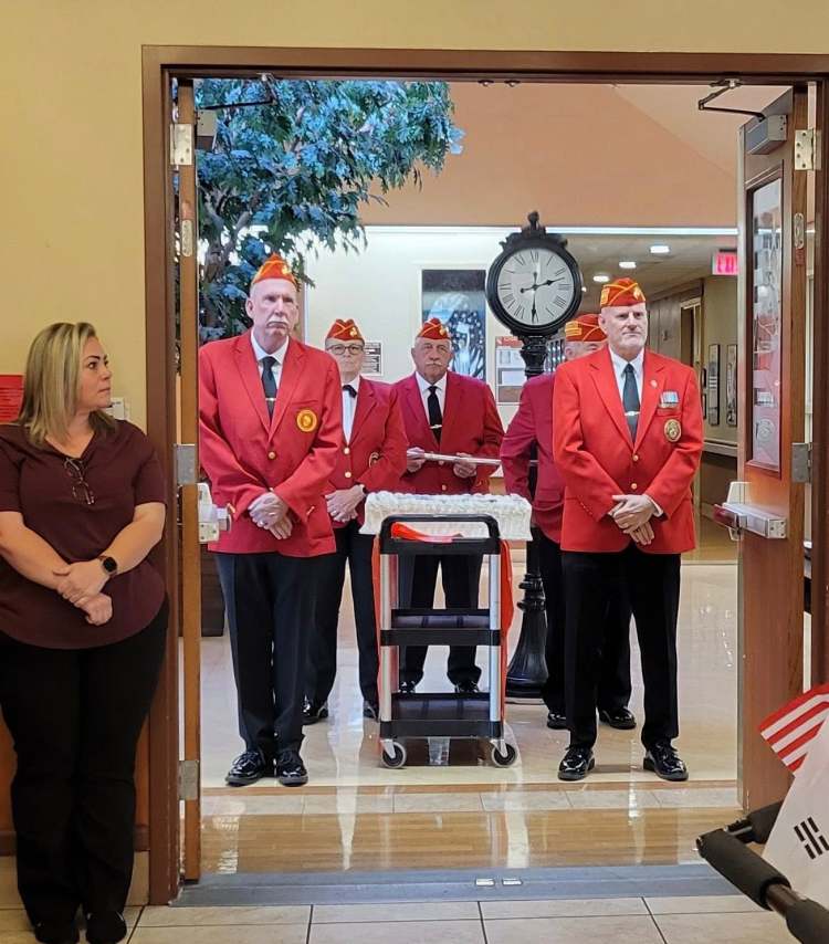 At the Southern Nevada Veterans Home, Officers of Marine Corps League 495 escorting the cake in for the US Marine Corps 250th Birthday Ceremony. It was a wonderful ceremony, well attended and supported by several veterans groups MCL 495, Military Order of Purple Heart, NDVS, Montford Point Marines and Sagebrush Women Marine Detachment. Semper Fi Marines and Happy 250th Birthday!