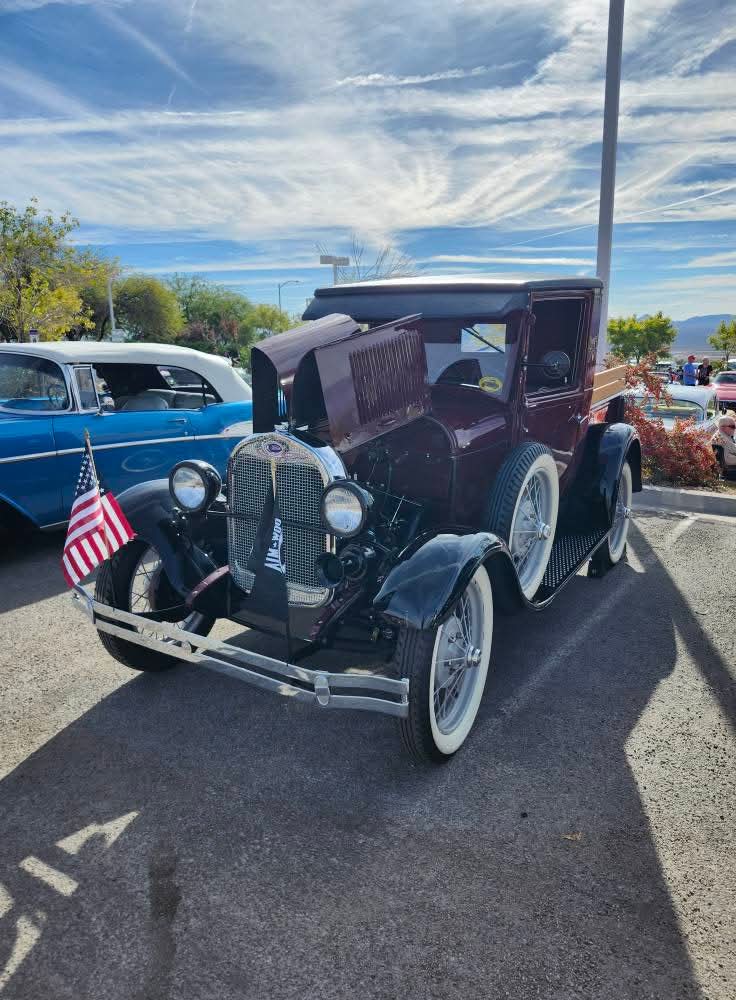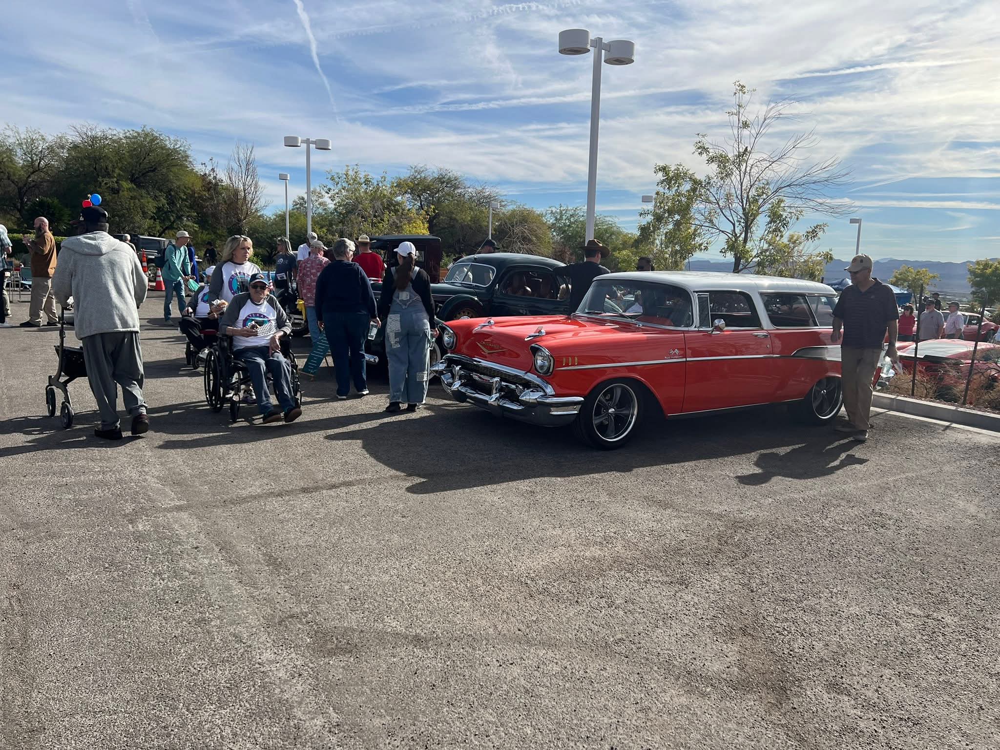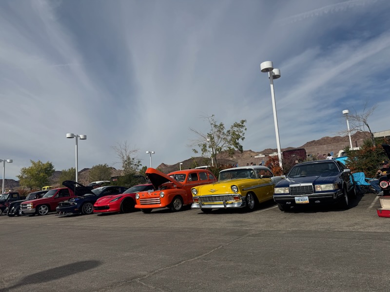 The Boulder City Cruisin Association put on a great event for the residents of Veterans Home on Veterans Day. A number of beautiful classic cars paraded and then parked for viewing. A barbecue was provided for all participants. Members of VVA 1076 visited with the veterans and one special resident Ann. Ann was all smiles surrounded by her 1076 comrades.