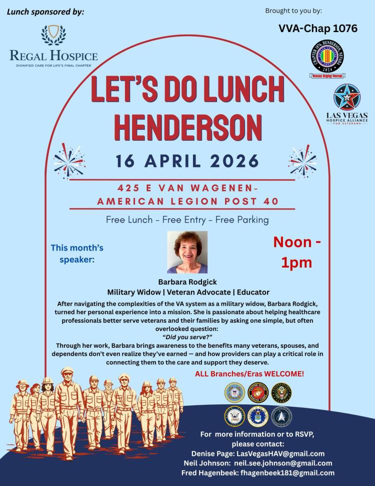 An excellent free lunch was provided by the Las Vegas Hospice Alliance. The“Let’s do Lunch” sessions available to any interested veteran or family. Consider joining us on the third Thursday of each month at 1200 in the American Legion Post 40 Hall Henderson.