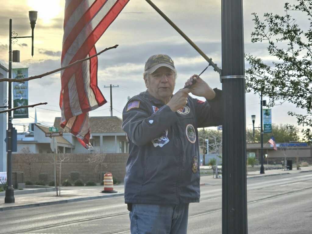 A crew of VVA 1076 volunteers removed US flags flown in honor of Veterans Day. The crew started at 0700 at the south end of Water St to Lake Mead Blvd. to remove the flags. After a breakfast followed at the Pass Casino. Thanks to all who helped !!