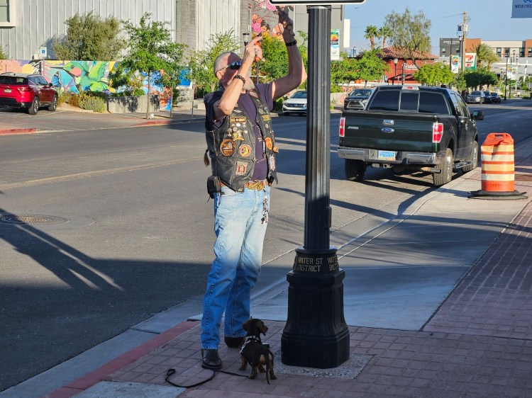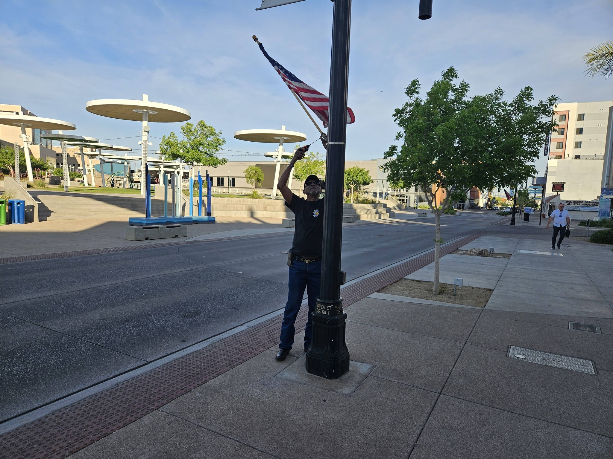 Flags Up! On Water Street District, Henderson installation by Vietnam Veterans of America, Chapter 1076, Thank you Cal Haggen, Philip Webb, Ralph Miranda, Michael Schwartz and Shelly Berkowitz helping the city of Henderson honor Armed Forces Day and continues through Memorial Day. Well Done Crew !!