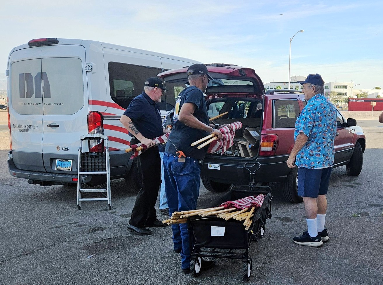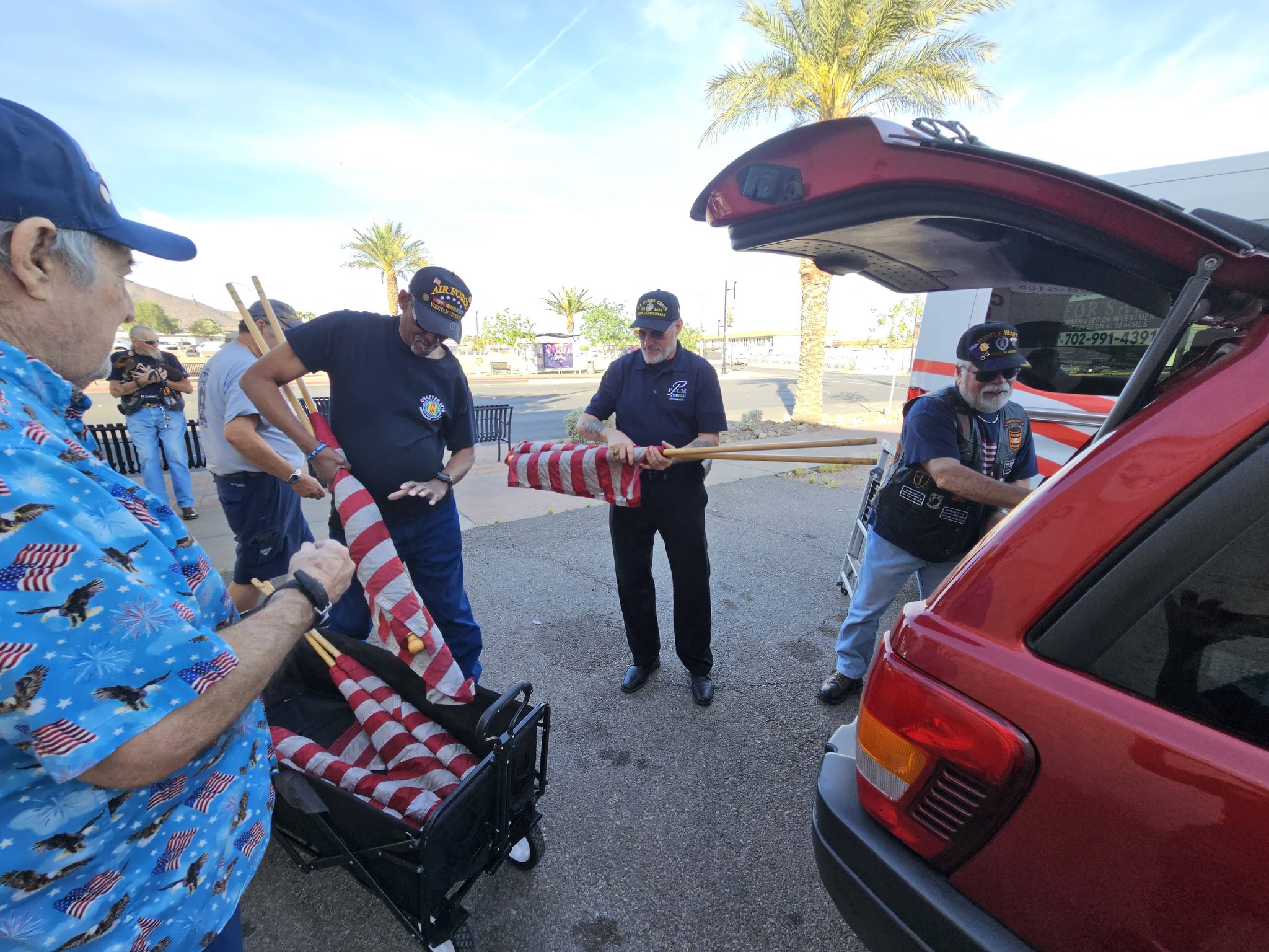 Thank you to those able to help installing the flags on Water Street, Henderson. Thank you! Cal Haggen for making repairs to the flag holders. Flags went up at 0700 and after the Crew enjoyed breakfast at the Peak.