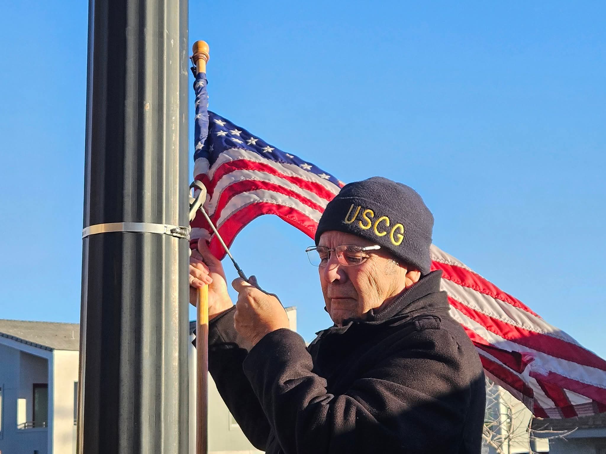 Members of VVA 1076 were up early for Flags Up on Water St. assembling 0700, the Flag Gang included Neil Johnson, Jan David Kopacz, Calvin Haggen, Mike Schwartz, Chris Gilmore, Shelly Berkowitz, Larry Eastman, Michael Berge, Phil Webb, Rick Kaufmann and Ralph Miranda. With the flags up, Water Street is ready for the Labor Day Weekend.