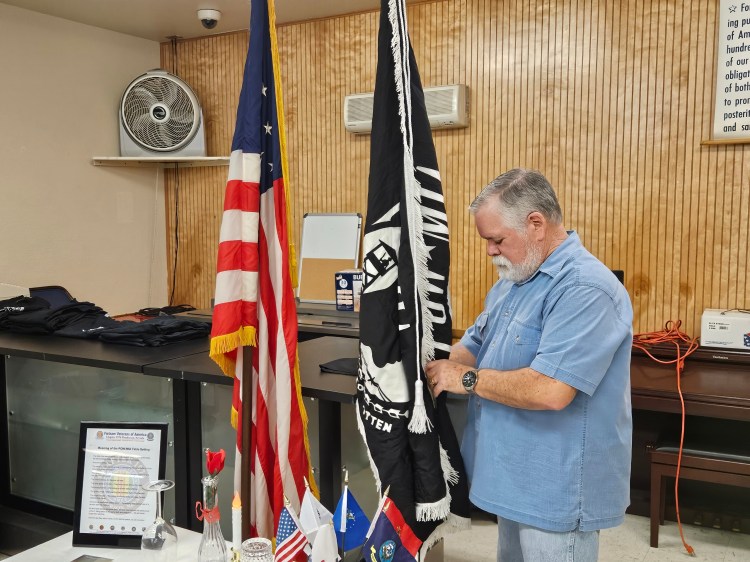 MIA Table in remembrance of our brothers still missing and the plaque explaining the meaning of each item represented. Table set up by Neil Neil C. Johnson, President Chapter 1076, DAV Commander Honor Guard, State Council Delagate and Secretary.