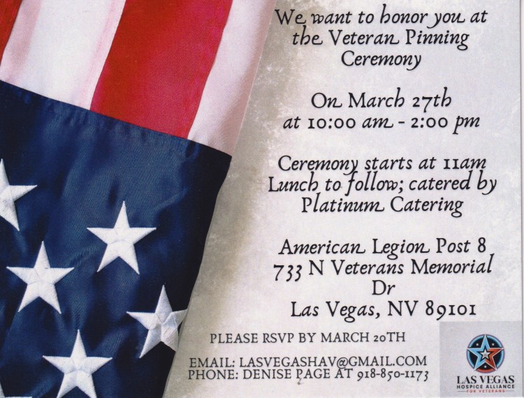 27 MAR 1000 Veteran Pinning Ceremony, AL Post 8 733 N Veterans Mem. Dr. LV – RSVP See Flyer