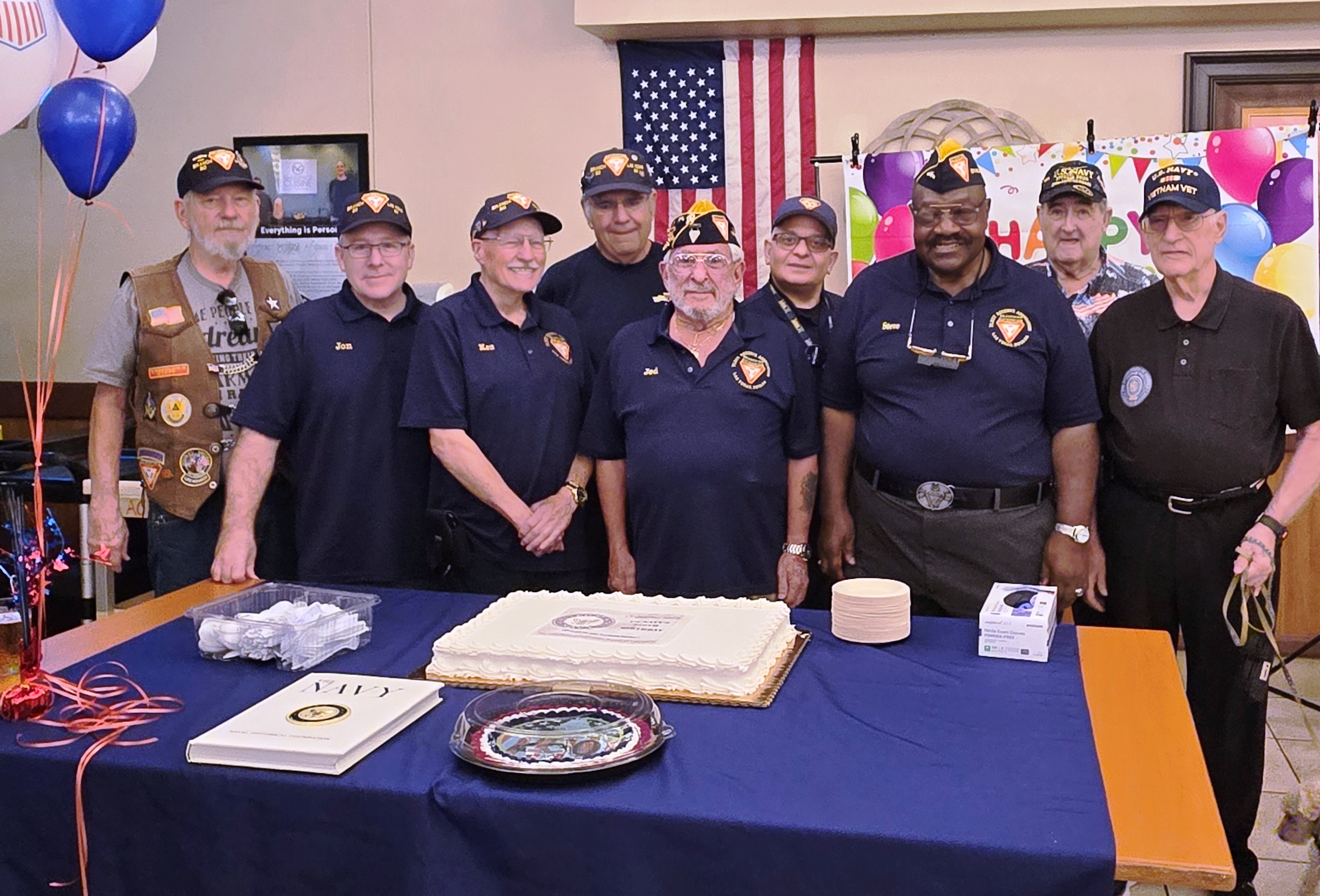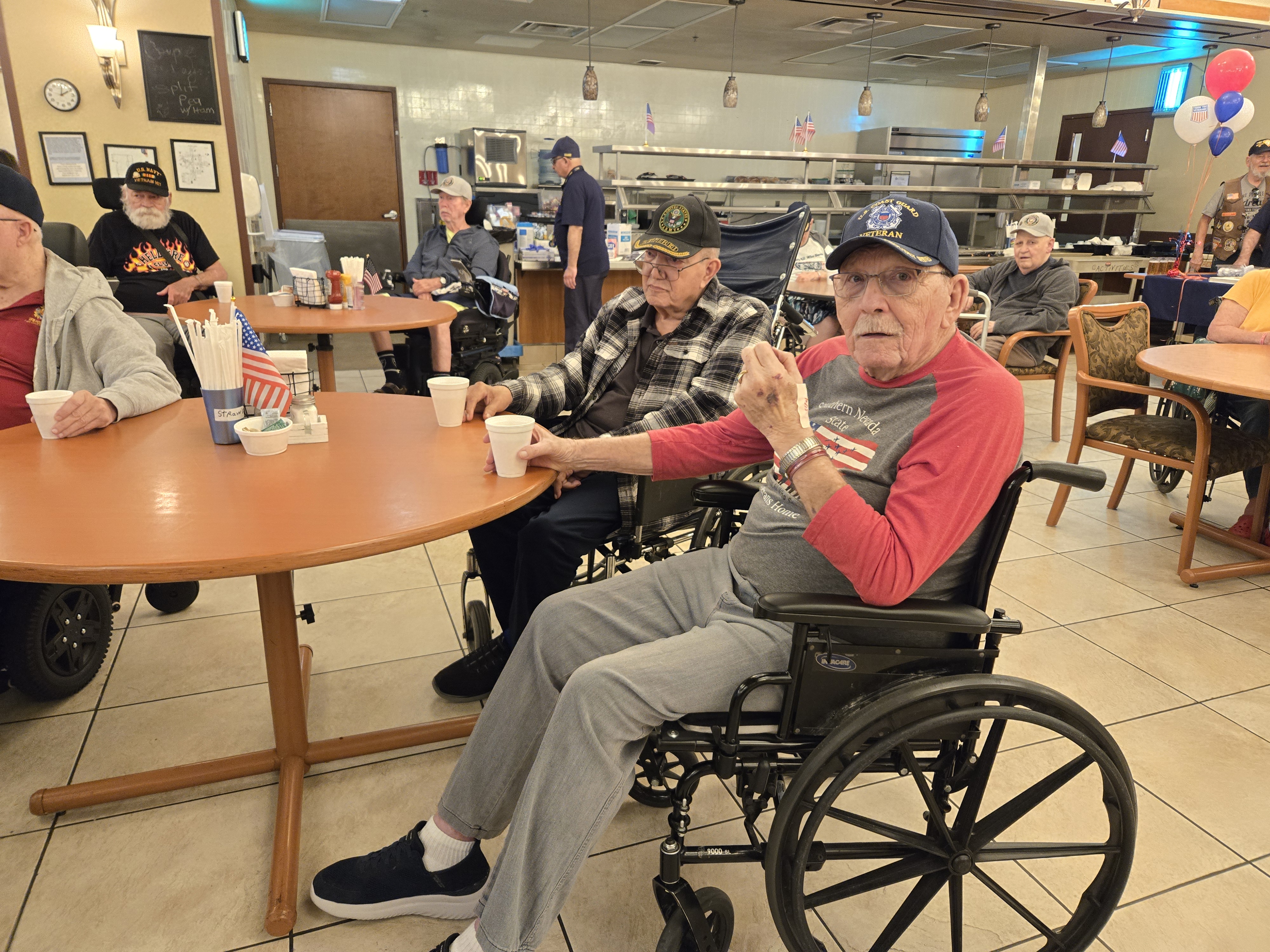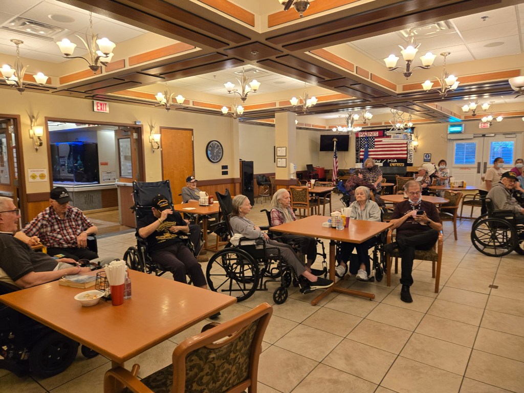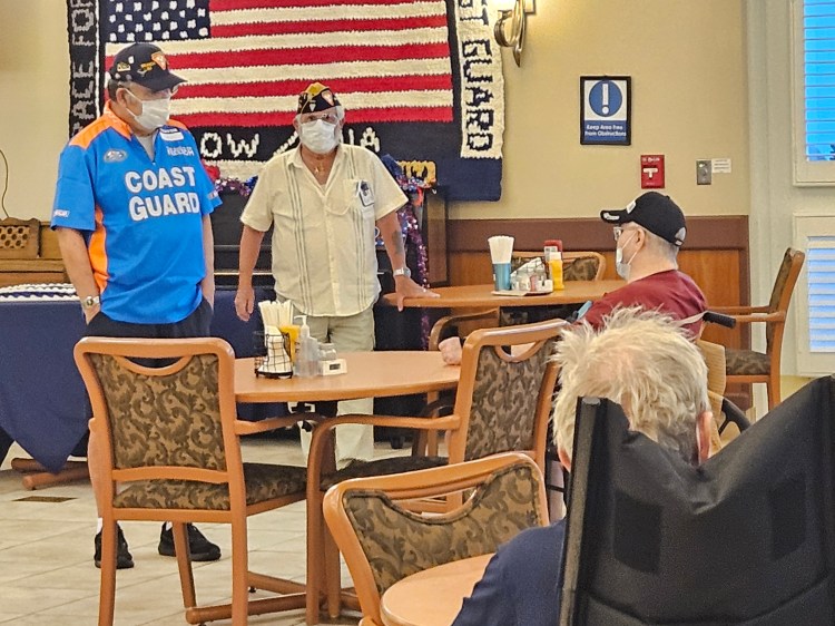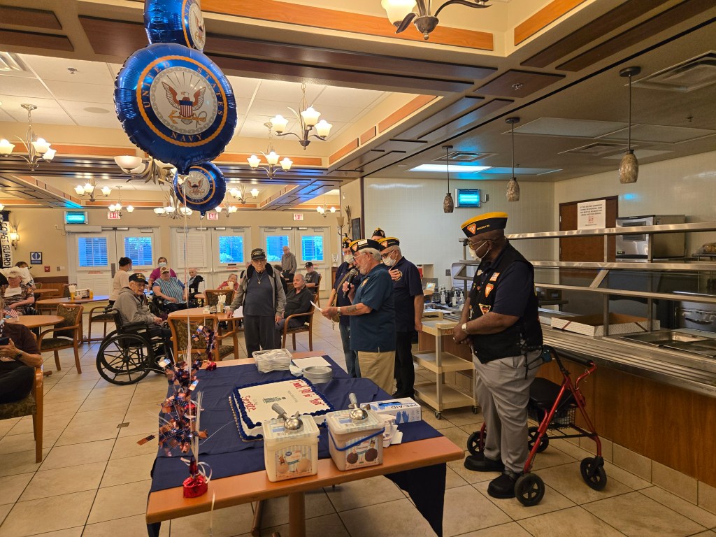 The Fleet Reserve Association Branch 90 hosted a cake party commemorating the 235 Birthday of the Coast Guard and Purple Heart Day. Members of VVA 1076 volunteered as well as Commander Ken Gonzalez, Military Order of the Purple Heart Chapter 730. The party started with FRA President Jed Levine leading the group in the Pledge of Allegiance. CG Veteran Rick Kaufmann Welcomed and Thanked the residents for their service. Rick spoke about the history Coast Guard, Commander Gonzalez spoke about the importance of remembering our heroes and the history of the Purple Heart. Two cakes were then displayed and cut. The first cut was by a 27-year RM CG Vet then Ken with a Purple Heart Veteran cut the other Cake. Attending the celebration was 1076’s Ann Sweat , who was all smiles with a visit from her friends. FRA will be back to celebrate the Navy birthday in November. The FRA is proud to host these events with assistance from other Veterans’ groups as well as the staff from the home. Well Done !!