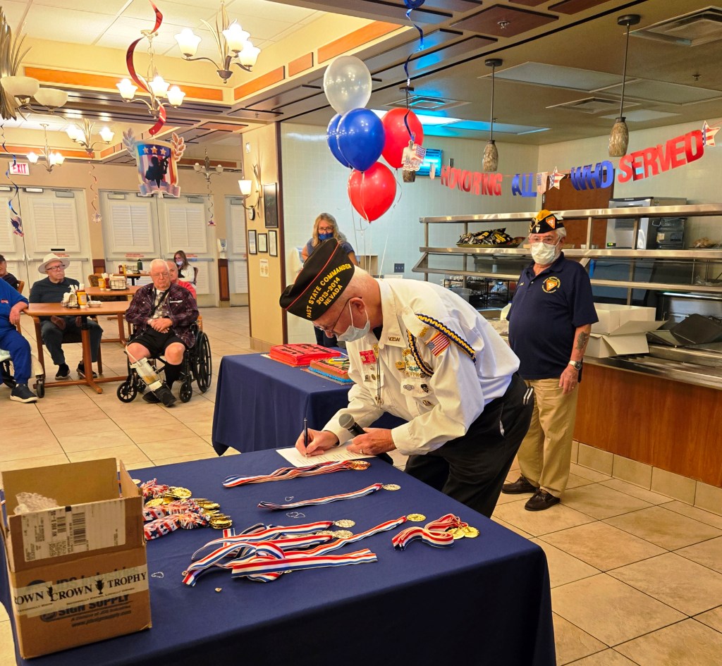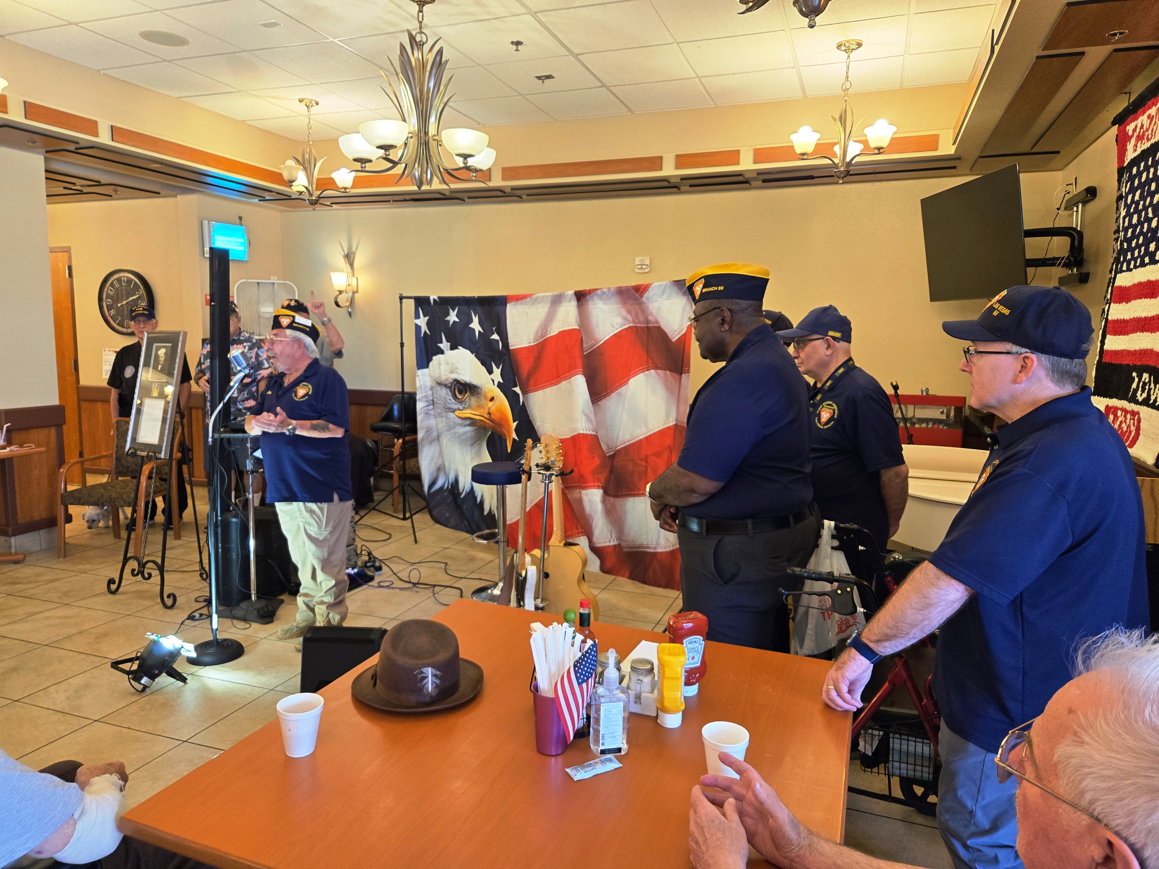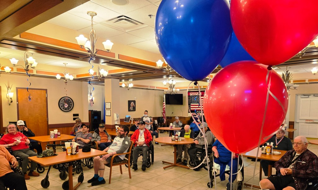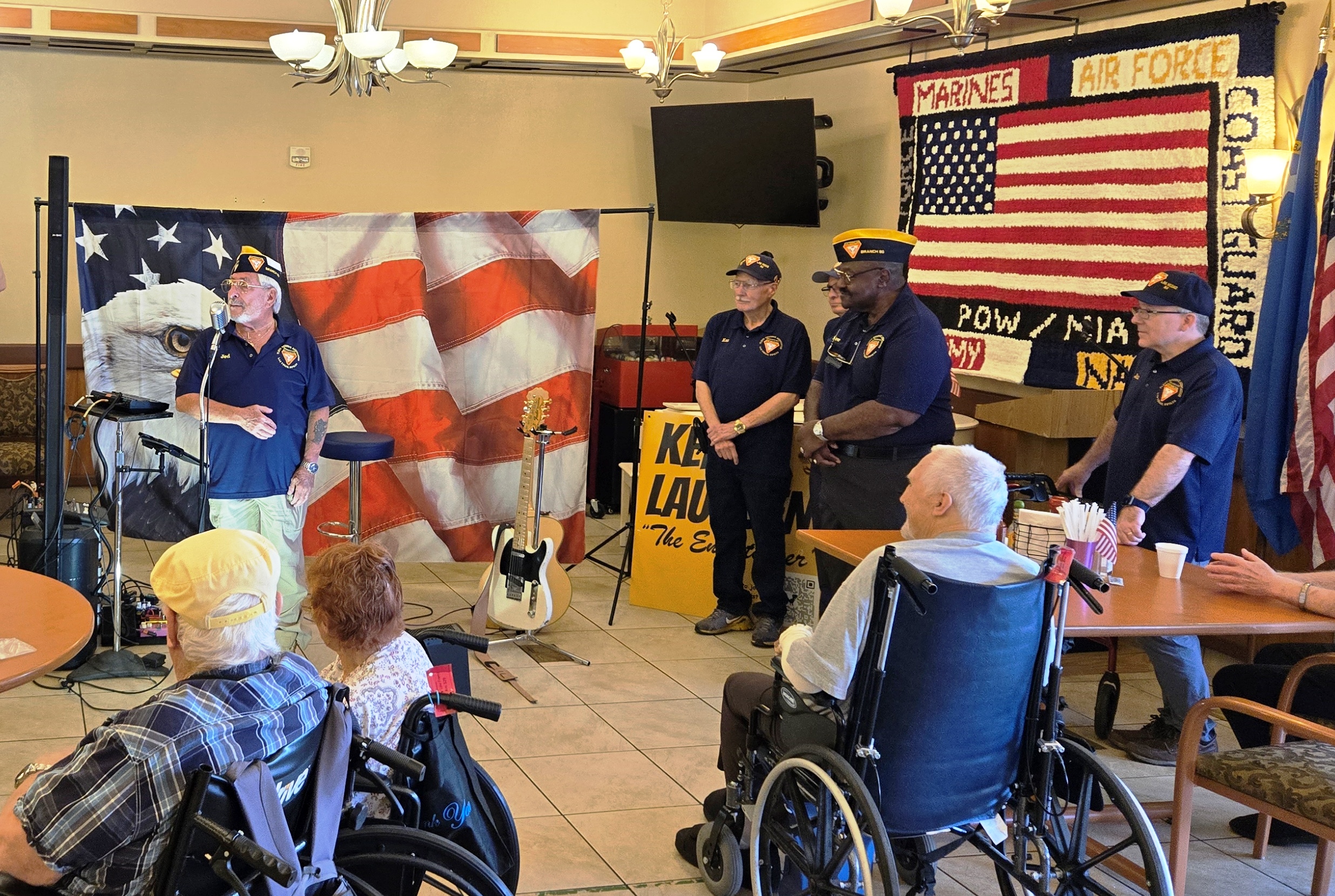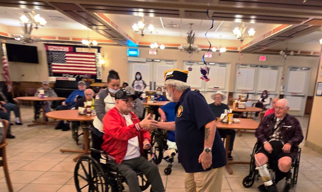 The Fleet Reserve Association Branch 90 hosted a cake party commemorating the 235 Birthday of the Coast Guard and Purple Heart Day. Members of VVA 1076 volunteered as well as Commander Ken Gonzalez, Military Order of the Purple Heart Chapter 730. The party started with FRA President Jed Levine leading the group in the Pledge of Allegiance. CG Veteran Rick Kaufmann Welcomed and Thanked the residents for their service. Rick spoke about the history Coast Guard, Commander Gonzalez spoke about the importance of remembering our heroes and the history of the Purple Heart. Two cakes were then displayed and cut. The first cut was by a 27-year RM CG Vet then Ken with a Purple Heart Veteran cut the other Cake. Attending the celebration was 1076’s Ann Sweat , who was all smiles with a visit from her friends. FRA will be back to celebrate the Navy birthday in November. The FRA is proud to host these events with assistance from other Veterans’ groups as well as the staff from the home. Well Done !!