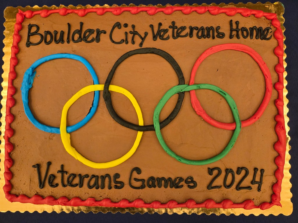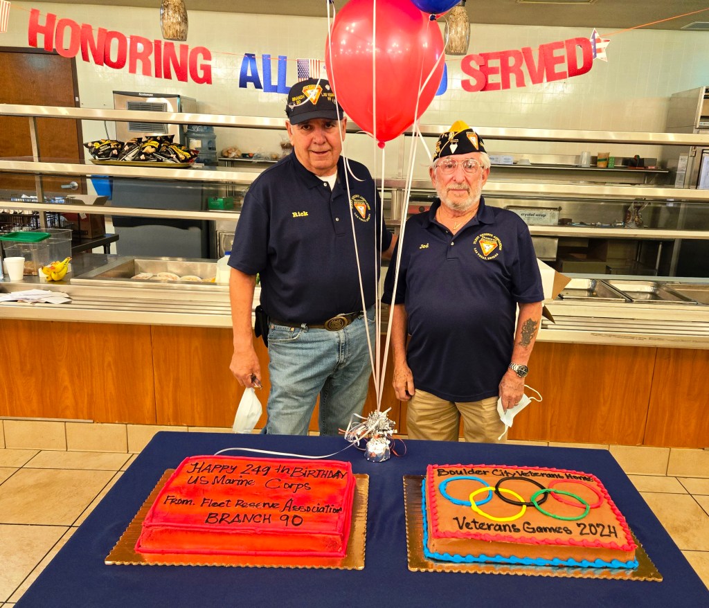 To celebrate the Coast Guards Birthday and Purple Heart Day, the Fleet Reserve Association Branch 90 Las Vegas hosted a Cake and Ice Cream Social at the Boulder City Veterans Home. The FRA donated the cakes. Fanny Butler, Activities Director coordinated the Boulder City Veterans Home Staff with the room set up and cake cutting. The Cakes were prepared by the bakery at Vons, Windmill and Bermuda.